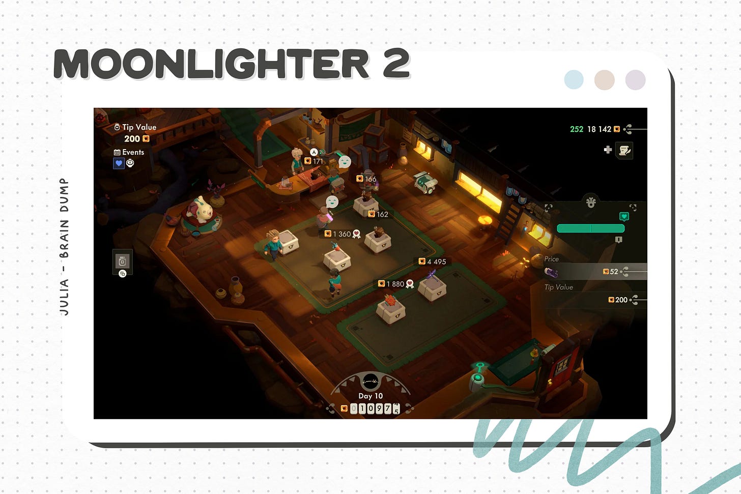 Le 29 mai 2018, je découvrais un jeu qui s’est hissé sur le podium de mes jeux préférés : Moonlighter — un jeu à double enjeu. Le jour, tu es commerçant : tu tiens une boutique d’antiquités. La nuit, tu deviens aventurier : tu explores des donjons (générés aléatoirement) pour récupérer des antiquités à vendre dans ta boutique (et ainsi de suite).